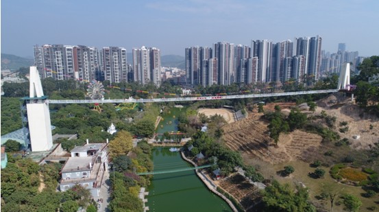 玻璃鵲橋是東莞龍鳳山莊影視度假村(中國唯一婚慶主題國家AAAA級旅游景區(qū))的主打項目之一,堪稱廣東首坐3D全透明高空玻璃橋,橫跨山莊同心湖,全長333米,懸空88米,寬2.2米。從高遠望,宛如巨龍懸空倚在兩山之中,欲騰云沖天、霸氣十足。