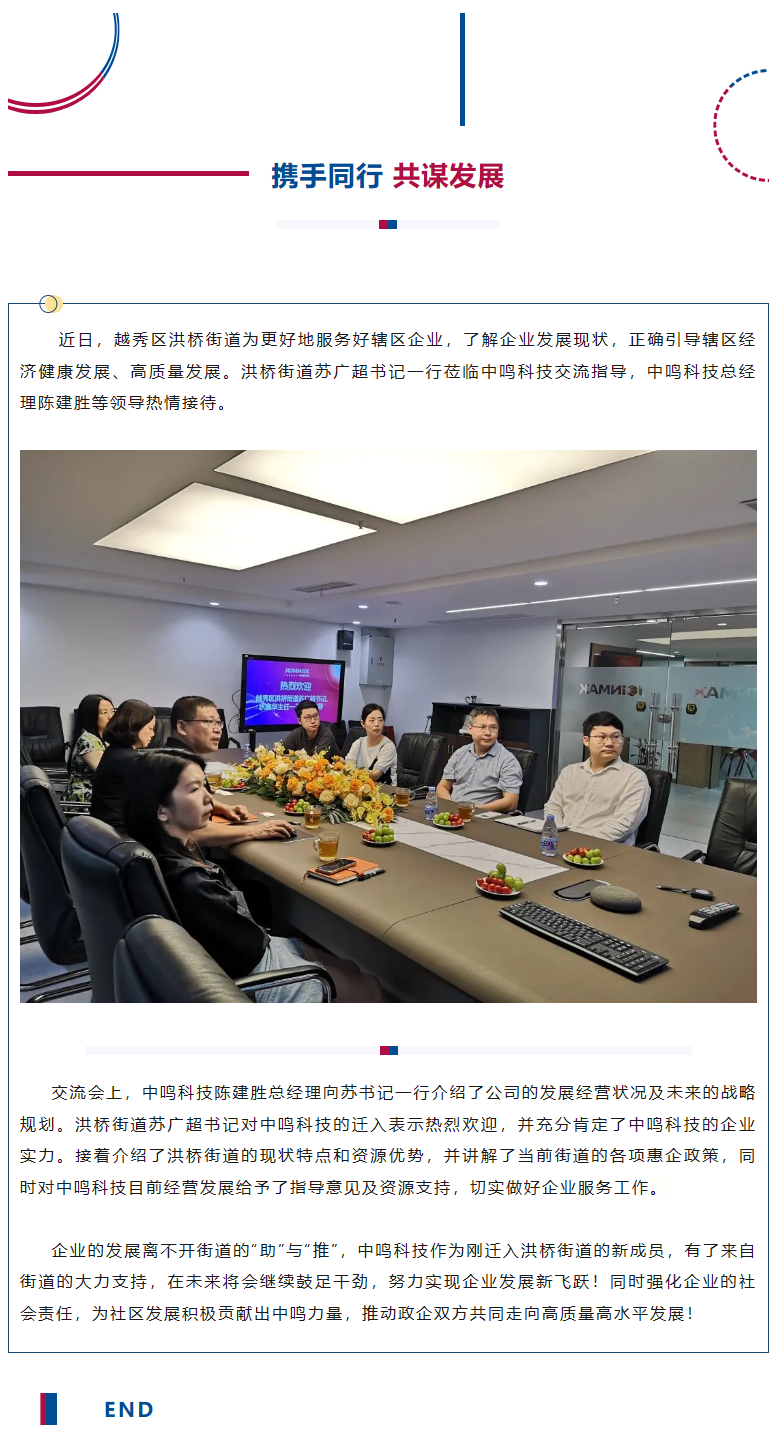 攜手同行,共謀發(fā)展——越秀區(qū)洪橋街道蘇廣超書記一行蒞臨中鳴科技指導(dǎo)交流
