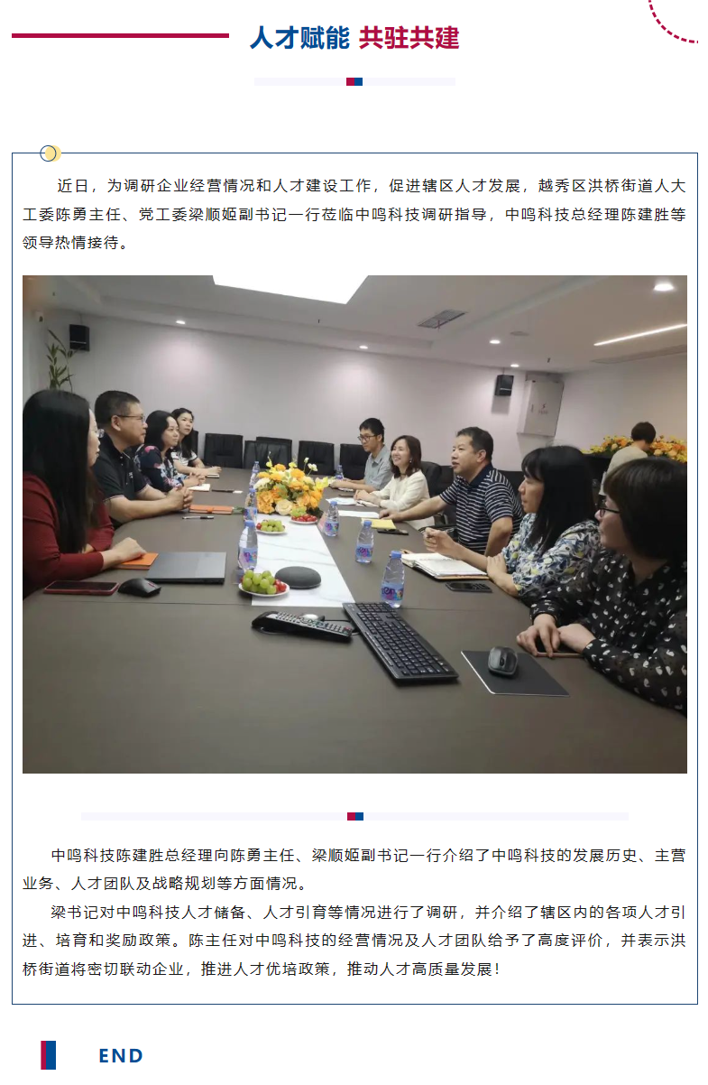 人才賦能,共駐共建——越秀區(qū)洪橋街道人大工委陳勇主任、黨工委梁順姬副書記一行蒞臨中鳴科技調(diào)研指導