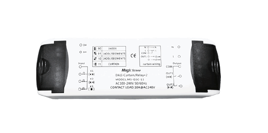 3、具備多種應(yīng)用功能,例如吊扇、排風(fēng)扇、吊燈、吸頂燈、多管燈盤、電動(dòng)窗簾的DALI控制。共4種工作模式可選擇,占用1或2個(gè)DALI地址。