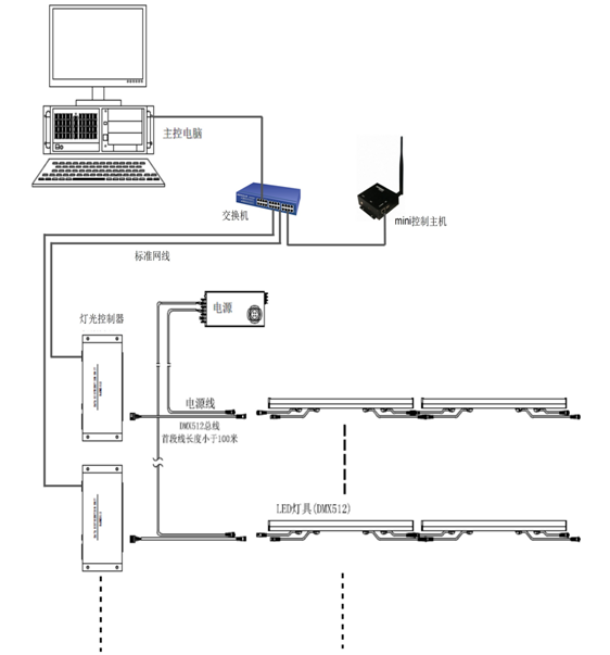 ●Mini控制主機(jī)實(shí)時(shí)分發(fā)上位機(jī)數(shù)據(jù)給下級(jí)燈光控制器,減輕上位機(jī)的工作量;