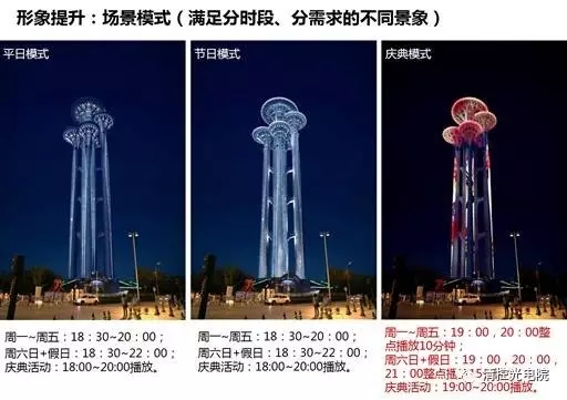 ? ? 照明現(xiàn)狀是塔冠亮度高,塔身亮度低;冠環(huán)亮度最高,但遠(yuǎn)視角可視面積小;再加上色彩較多,看上去形體略顯分離,效果整體性待改善,原創(chuàng)“生命之樹(shù)” 理念未表達(dá)。冠環(huán)、冠頂、塔身亮度比為83:7:1。