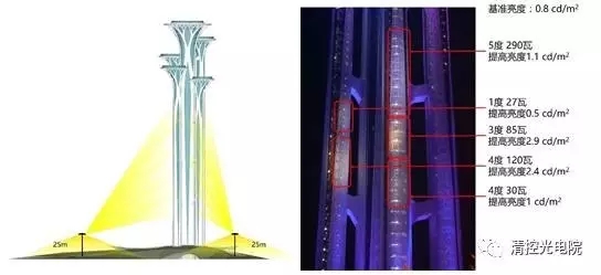 1)塔身立面:塔身周邊設(shè)置8組燈桿,每桿20盞極窄光束投光燈,定向投射塔身部位,光斑拼接照亮整個(gè)塔身;用最低能耗的燈具總量,比原來(lái)亮度提高了15倍。