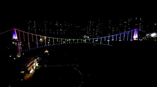 項目采用基于4G無線互聯(lián)網(wǎng)技術(shù)可遠(yuǎn)程監(jiān)控的JOINMAX異步燈光控制系統(tǒng),通過移動終端應(yīng)用軟件APP,可對系統(tǒng)的供電和信號進(jìn)行遠(yuǎn)程監(jiān)測和控制。同時出于玻璃橋觀光用途安全性考慮,電力系統(tǒng)采用兩級電壓變換,有效解決了橋身對設(shè)備重量限制及高壓安全隱患問題。
