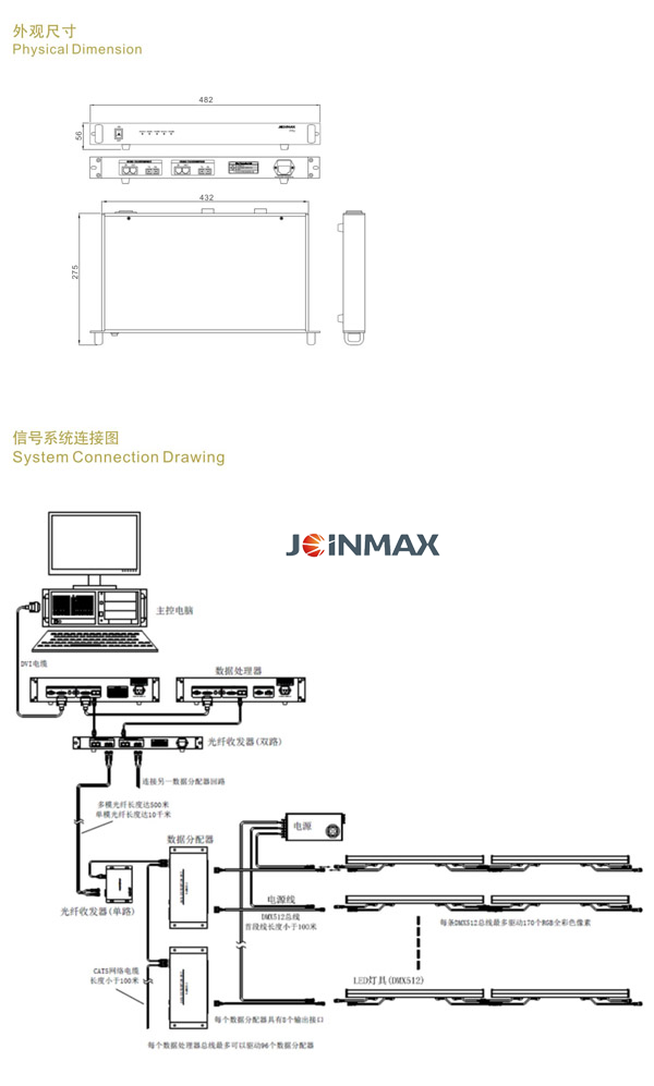 ??The Dual-fibre optic transceiver provides2 independent channels for signal exchange in between Joinmax’s specialised network data signals and fibre optic 100BaseFX (SC/ST interface). This is suitable for large scale lighting control systems that need many Data Processors. With the fibre optic interface, it allows the data transfer between the Data Processor and DDU to go up to 10km. This Dual-fibre optic transceiver is only suitable for Joinmax’s lighting system and not for standard signal exchange on the TCP/IP network. Features of the Dual-fibreoptic transceiver are as follows: